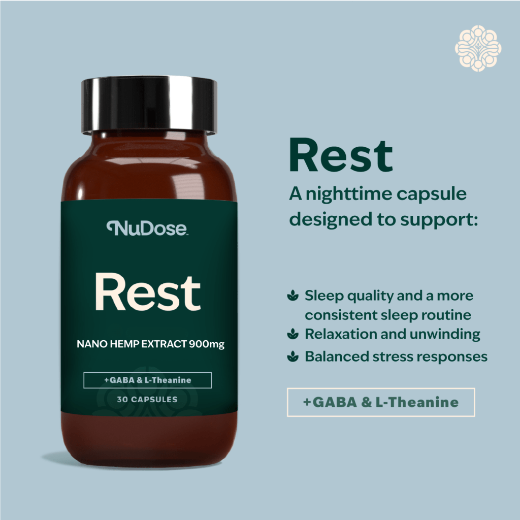 Rest by NuDose is a nighttime capsule designed to support a calm, restful sleep experience. This blend combines nano-hemp extract with select amino acids to support relaxation and the body’s natural sleep rhythms, without melatonin.
